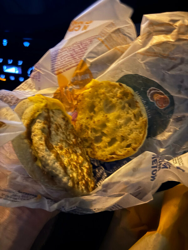Приехали утром 04.01.26. Нам в дальнюю дорогу. По традиции всегда заезжаем в мак перед дальней дорогой. В итоге стояли минут 15 и ждали когда они откроются, хотя они должны были уже работать к этому воемени. Заказазали 2 бургера с свинной котлетой и яйцом и один фреш поюс еще всякой фигни. В итоге едем по мкаду, разворачиваем заказ и понимаем что маффины без яйца. Убогое обслуживание, сотрудники слепые. Чек прилагаю.