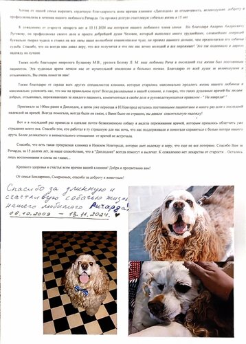 Хотим от нашей семьи выразить сердечную благодарность всем врачам клиники "Диплодок за отзывчивость, великодушие, доброту и профессионализм в лечении нашего любимого Ричарда. Он прожил долгую счастливую собачью жизнь в 15 лет. К сожалению от старости лекарств нет и 13.11.2024 мы потеряли нашего любимого члена семьи. Но благодаря Андрею Андреевичу Луговову, он профессионал своего дела и просто добрейшей души Человек, который выполнял много труднейших, сложнейших операций по установке титановой пластины при разрыве связки и удалению грыжи в спинном мозге. Этот доктор буквально творил чудеса и ставил на все лапы наше волшебное спаниелевское чудо, моё прожил намного дольше, чем предполагала его собачья судьба. Спасибо, что он всегда нам давал веру, что все получится и что пес нас вечно молодой и все переживет! Это так поднимало и дарило надежду на лучшее. 24/ всегда был на связи по тел🙏✅ Также особо благодарю невролога Буланову М.В., уролога-нефролога Белову Л. М. наш любимец Ричи в последний год жизни был постоянным пациентом. Эти чудесные врачи лечили нас от мучительной эпилепсии и больных почках. Благодарю от всей души за великодушие и отзывчивость, Вы очень помогли нам! Также благодарю от сердца всех других специалистов клиники, которые старались максимально продлить жизнь нашего любимца и максимально успокоить нас, что мы на правильном пути! Спасибо всем администраторам, которые всегда синами связывались, передавали оч быстро всю информацию врачам, это нам порой спасало жизнь! СПАСИБО!!! 🙏 Всегда рассказывая о вашей клинике, я говорю, что таких душевных врачей бы людям: добрых, отзывчивых, переживающих за каждого пациента, компетентных в своём деле и руководствующихся правилом - " Не навреди! " Приезжали за 100км ранее в Диплодок, затем уже переехав в Н.Новгород остались постоянными пациентами и много раз шли с последней надеждой на врачей. Всегда помогали, всегда были на связи, с Вами было не страшно, вы давали спасительную надежду! Вы продлили жизнь нашему пушистому чуду! 🙏✅🫶 Вот и в последний раз принесла в одеялке почти безжизненную собаку я видела переживания врачей, которым пришлось облегчить уже страдания моего пса. Спасибо тем, кто работал в ту страшную для нас ночь, что нас поддерживали и помогали справиться с болью потери нашего друга. Более деликатного и внимательного отношения от врачей не встречала. Спасибо, что есть такая прекрасная клиника в Нижнем Новгороде, которая дает надежду и веру, что еще не все потеряно. Спасибо Вам за Ричарда, за 15 долгих лет, за наше спокойствие, что в "Диплодоке" всегда помогут и вылечат.🙏 к сожалению нет лекарства от старости... 😭 Остались лишь воспоминания и слезы на глазах... 😭 Крепкого здоровья и счастья всем врачам вашей клиники! 🙏❤️добра и процветания вам! БУДУ ВСЮ ЖИЗНЬ БЛАГОДАРНА ВАМ ЗА ВАШУ РАБОТУ И ДОБРОТУ!!! От семьи Бондаренко, Смирновых, спасибо за доброту к животным!🙏🙏🙏❤️