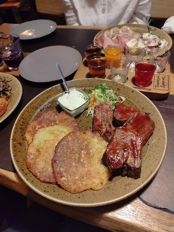 Хотел с семьёй отведать драников и вкусняшек белорусской кухни. Выбрали за яркие картинки меню и отзывам, но все подтвердилось, не пожалели. Драники с языком - высший балл. Особенно порадовали настойки. Отменное сырье, мягкий вкус, насыщенность на уровне (перепробовал в разных местах и странах на вкус - есть с с чем сравнивать). Настойки - топ, стоит пробовать обязательно. Из любимого - хреновуха, анисовая и первак.