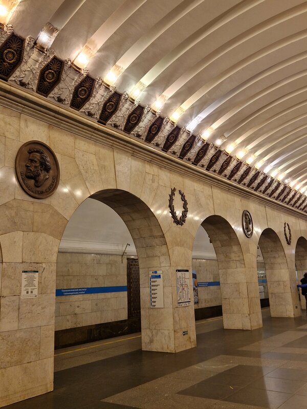 Обе "Техноложки "1 и 2 ,по сути -одна станция с общим очень красивым выходом на Московский проспект и с двумя ,в высшей степени удобными пересадочными подземными павильонами.Название обязывает ...Портреты известных русских ученых в барельефах ,на стенах .Павлов,Менделеев,Пирогов ,Попов и другие.Быстрая пересадка не "даёт "возможность поразглядывать)Но шанс есть!!Не стоять в плотной толпе пассажиров,а погулять минутку -другую по просторному залу).