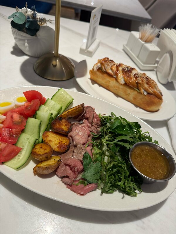Очень приятный ресторан. Вкусная еда. По моей просьбе сделали теплый ростбиф в салате. Шикарное обслуживание. Приятный интерьер