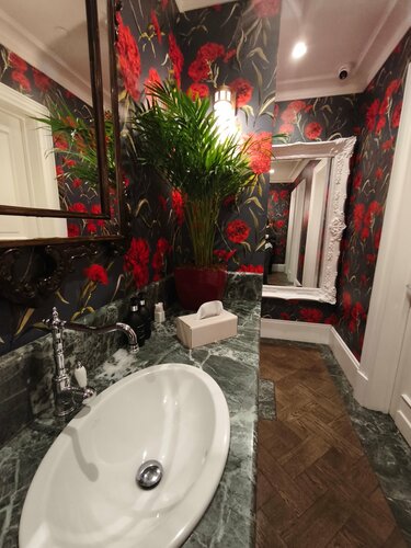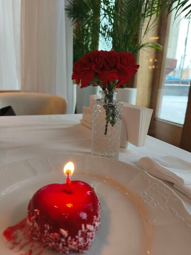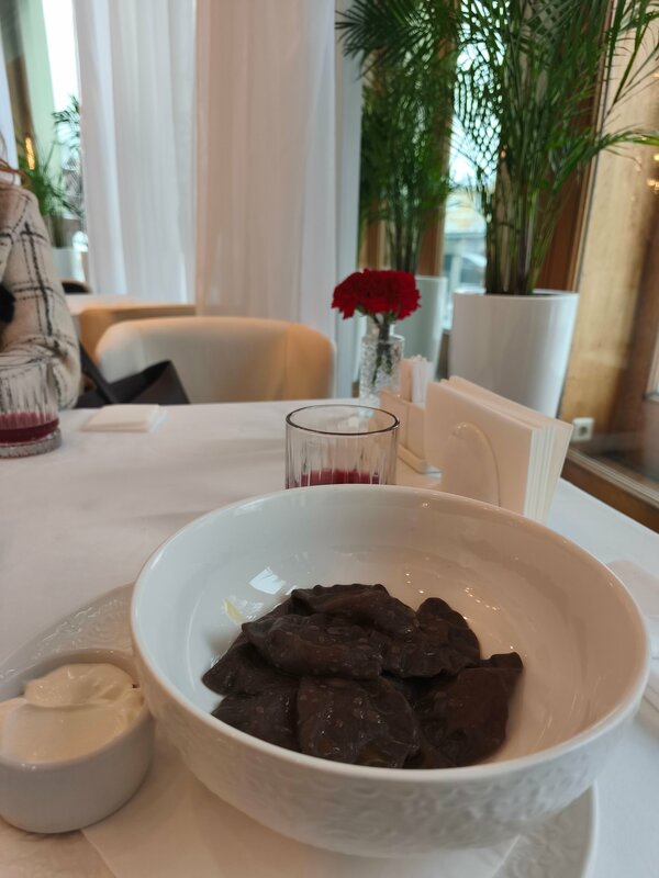 Высокие окна, в которые смотрятся Кремлевские башни, нарядные потолочные мозаики, белоснежные скатерти и яркие алые акценты: бокалы, гвоздики и помада официанток. Все это очень красиво, стильно, русско и сразу задаёт атмосферу праздника. Ради чего мы, собственно, и пришли сюда к завтраку - праздновать День рождения. Все было быстро, просто и вкусно: черемуховые вареники, гречневая кедровая каша, изумительный паштет с ягодами, шоколадный эклер и омлет с сыром. Чокались ягодным квасом и кофе. Приятная неожиданность: девушки спели и преподнесли мусссовое сердечко с праздничной свечой. Именинный завтрак удался! Ценник тут гуманный, а туалет роскошный. В общем, стоит посещения, только бронировать необходимо заранее.