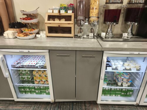 Если у вас будет выбор, то сюда заходить не нужно. Если нет, то будьте готовы к не комфортным моментам в Бизнес-зале, созданном для комфорта: Тут нет туалета. Совсем. Никакого. Если он вам понадобится (а понадобится непременно), то вам придется оставить вещи (одиночкам будет совсем не ок), выйти из Бизнес зала и отправиться к эскалатору, ведущему вверх. Подняться на этаж и прогуляться до обычного туалета. Про душ и игровую комнату, как вы понимаете, говорить не надо. Кресел и столов в изобилии. Народу было ранним утром мало, но если тут все будет заполнено, то это будет непросто - линия раздачи очень маленькая и все скученно в одном месте. Еда тут хуже столовской: там она хотя бы живая и приготовленная. Тут все пластиковое и разогретое-замороженное: блины, сырники, порошковый омлет. В плюс пошли овсянка и салат из крабовых палочек. Сметана - расфасовка некоего крахмалистого продукта с комочками.  Выпечка вся сухая и это просто печенье, которое гордо именуется пирожными. Соки и морсы - сахарная химия. Кофе лучше не пробовать. Конечно, экономия сейчас на первом месте, но тут она заменила все места: даже пиво и кола тут платные по ценам аэропортовским. Бесплатные напитки кофе+чай+вода+бурда в виде сока. Я не брюзга, но так нельзя. Газеты-журналы есть. Женщина на ресепшн усталая и отстранённая. Сам зал отделен от пространства аэропорта цветами в горшках и верёвочками на стойках. Открытая резервация такая... Вопрос: зачем??