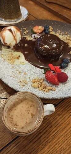 Из плюсов: 1. Очень вкусная еда, попробовали и десерты и основные блюда. Стейк из лосося выше всех похвал, курзе - огонь! 2. Нам досталась заботливая, вежливая и профессиональноая официантка - Зухра. Сразу предупредила о времени готовки, оперативно обновляла стол. 3. Расположение недалеко от моря Из минусов: 1. Не хватает уюта в интерьере 2. Не всегда оперативно убирают за другими гостями, остаётся, например, грязь на поле Поставила 5-, так как это мелочи и плюсы явно перекрывают их.