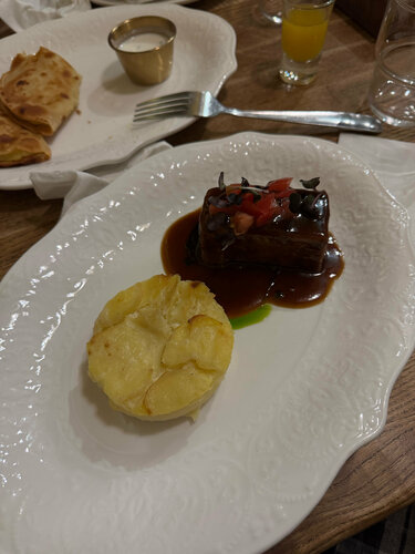 Симпатичное заведение, но не могу сказать, что супер вкусно. Так, обычно, как будто в блюдах не хватало какой-то изюминки. По рассказам официанта, решили взять баранину (не помню точное название), он расписал, тааааак красиво, что там томаты сверху, супер вкусный соус, картофельный Гратен, и сказал, что блюдо исключительно «мужское». Наши мужчины взяли и посмеялись с порции, потому что им пришлось до заказывать себе что-то еще, а ценник там выше среднего, за такие порции. Из плюсов, там была детская комната и детское меню. Может это нам не повезло, но ставлю 4 звезды, исключительно из-за атмосферы, детской комнаты, неплохой подачи блюд. Но я бы своим друзьям не посоветовала бы.