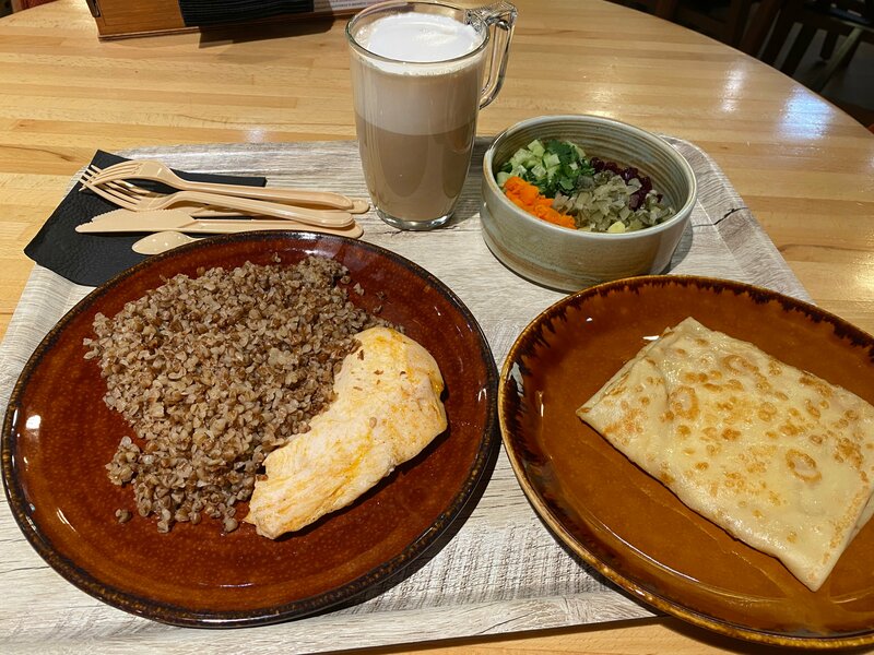 А мне здесь нравится. Блин зачетный с ветчиной и сыром. Томленая грудка с гречкой очень вкусные. Винегрет может быть и на любителя, с ароматным маслом, все ингредиенты отдельно, смешиваете сами. Кофе отличный с пенкой.