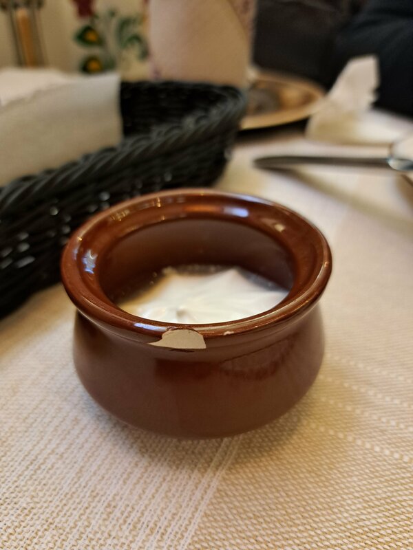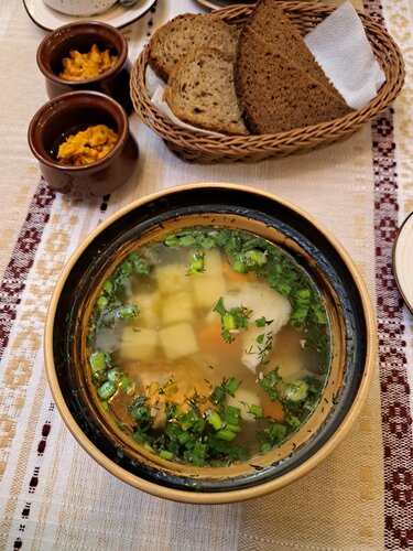 Заведение оставило смешанные чувства. Оформление и антураж порадовали глаз. На счёт кухни, наверное надо было остановиться на первых блюдах. Супы вкусные. А вот ассорти из вареников не порадовало. Начинка у нескольких вареников была холодная, но удивило больше подача сметаны непонятно была это вода или отслойка, пробовать не стала 😁 Ну и скол на посуде не добавляет эстетики.