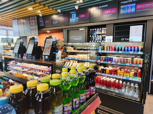 6 часов от Москвы , мы уходили с М12 направо , надо было заправиться , сходить в туалет и купить еды. На этой АЗС приятно тратит деньги! Чисто , просторно, ярко и много вкусняшек! Также большой выбор ГСМ , напитков, всяких автотоваров. Есть даже безалкогольное вино ( смотрите фото). Видно, что на данной заправке во главе стоит принцип клиентоориентированность! Молодцы!