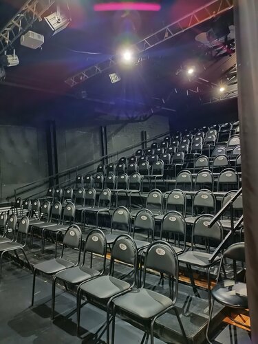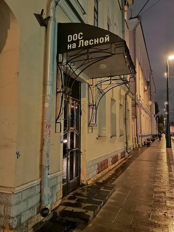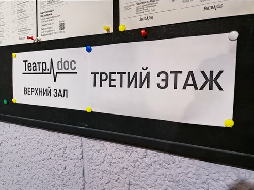 Из выхода #3 станции метро "Менделеевская" доходим до перекрестка с трамвайными путями. Их переходим и идём влево( трамвайные пути слева остаются). Буквально минут 7-10 и можно увидеть крыльцо с козырьком, где надпись DOC театр. (рядом с аркой). Входим как в обычный подъезд ( кто приходит чуть раньше, можно внутри погреться). Театр на третьем этаже. При входе в фойе -кофе-автомат, два туалета, чуть дальше - гардероб самообслуживания, зал со столиками и зрительный зал за занавесом. В зале 10 рядов, видимость отличная. Посещала спектакль "Кантград"- на основе документальных фактов. Очень трогательно. В зале свежо( берите шарфы).