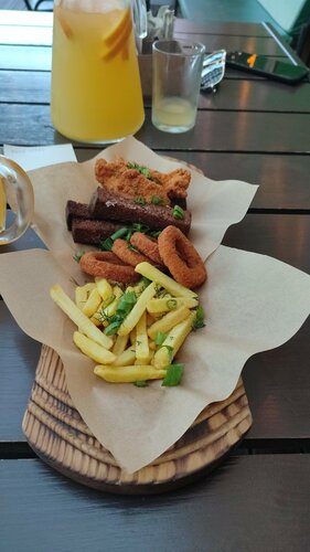 Вкусный судак, бургер, оливье с форелью и пельмени. Калитки с картошкой немного мы не поняли 🫣 в помещении духота, лимонад без льда, шампанское не охлажденное.