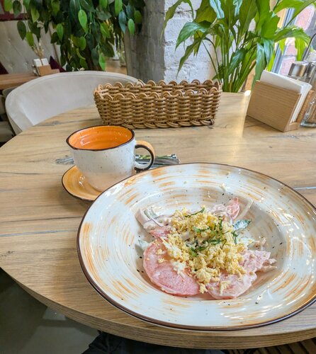 Не знаю, как основное меню, но к бизнес ланчу есть вопросы. Стоит он подозрительно недорого (470) и не зря. Салат и суп ну очень небольшие порции, а в моем случае одна ножка была такой себе свежести и приготовления. По цене сразу понял, что не наемся и взял сверху завтраковый омлет, который был прямо очень сухой, так что омлет не советую, лучше возьмите просто яичницу или скрембл. Еще учтите, что состав ланча жестко привязан ко дню недели и блюда выбирать нельзя. А какие плюсы: это очень суетливая официантка, имени к сожалению не знаю. Она одна супер успешно обслуживала всех и никого не заставляла долго ждать, давно таких энергичных не видел.