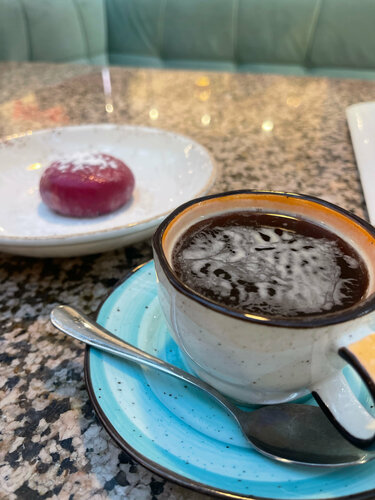 Впервые были в этом заведении. Приятная обстановка, хорошее обслуживание официантов. Столики стоят так, что никто никому не мешает. Про еду - Вкусно. Подача блюд - быстро! Сын заказывал гамбургер - принесли перчатки ( оказались малы). Без вопросов принесли перчатки, которыми пользуются повара и легко оделись на мужскую руку. Официант приятный, обращает внимание на стол, быстро убирают посуду. В день нашего посещения была акция «кофе плюс мотти» - я брала смородиновый , очень вкусный, кофе хороший.