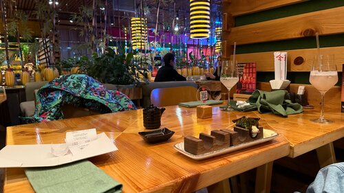 Родители устраивали небольшой банкет на 12 человек. Забронировали за несколько дней. При входе никто не встретил, не проводил, пришлось самим искать место. Еда сомнительной подачи и качества, курица не очень похожа на курицу, баранина не очень похожа на баранину. Цены как в неплохом ресторане в центре с отличным обслуживанием и подачей. Обслуживание на уровне ниже нуля, за которое в счет включено 10%, видимо по этому персонал забивает на качество обслуживания. Когда даже два человека заказывали блюда, то официант принося их кричал через весь стол, что принес блюда и спрашивал кому нести, перебивая при этом разговоры. Пытались пару раз угадать кому принесли блюдо и не угадывали, в итоге приходилось самим быть официантами. Стол был на улице, когда пришли уже какое-то время стояли мясные закуски в тепле, на улице около 25 градусов тепла, гостей еще не было. Стаканы под напитки пахли затхлостью. Вишенкой на торте оказался саксофонист не попадающий в ритм авто-аккомпанемента, которого пришлось слушать оставшийся вечера от уровня игры которого заболела голова. Писать можно много, но мне совсем непонятно откуда такие высокие оценки при таких ценах и отсутствующем обслуживании. Дата посещения: 08.06 в 18:30.