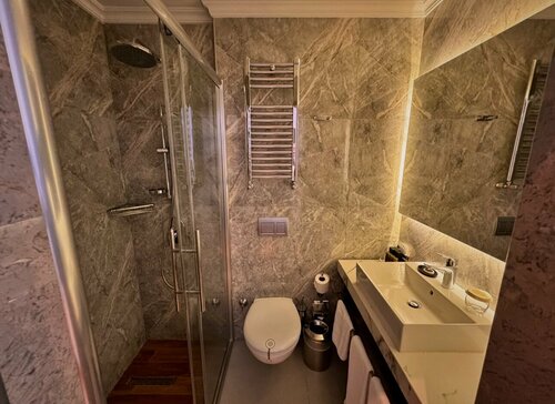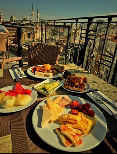 Итак. Стамбул. Даты пребывания с 28.05 по 01.06. Номер DeluxTripleFrench + sofa (нам достался 215 2 этаж.. сразу скажу что окна выходят в глухую улочку , вид так себе , поэтому если хочется красиво , бронируете сразу с балконом и видом на Taksim, ибо на месте договориться не получится, в сезон отель супер популярен, занято всё!!! При этом ни разу не увидела толкучки где -либо , постояльцы как-то рассредотачиваются по отелю ))) сразу пробегусь по минусам , благо их немного , а точнее один. Это слышимость. Слышно персонал, и очень слышно соседей. Тагила тут не встретить, публика скорее взрослая и супер адекватная, но попадаются темпераментные иностранцы , которые просто громко разговаривают ))) нас именно такие попались , и ночами было не очень комфортно … один раз я даже спустилась на ресепшен для решения данной проблемы .. у слову проблема решилась , но на час полтора ))) Теперь к плюсам!!! Главный это конечно изумительное расположение . Рядом метро и площадь Taksim, там же фуникулер до порта . Там паромы и можно отправиться на экскурсию по Босфору , либо на Принцевы острова… главная улица Истикляль , в пару минутах ходьбы … галатская башня и не только … вообщем супер расположение , моя личная рекомендация ! Сам отель очень современный , много зон для отдыха , есть хамам , но мы не дошли )) уборка каждый день , вопросов нет! В номере есть абсолютно все, можете смело не везти ничего !! На фото можно посмотреть !! Фен не как везде , а мощный нормальный ! На 6 этаже ресторан и открытая веранда с видом . Классное место , одно удовольствие завтракать с таким видом. Выбор однозначно есть , голодными не останетесь!!! В отеле есть русскоговорящий персонал , девушка, она сидит справа от ресепшена , в зале с камином. И да ,при звезде берут депозит 100$, потом возвращают … на день рождение отель приготовил мне комплимент в номер . В виде именного тортика , очень вкусного и ещё они аокдоставляют скидку 20% на ужин или обед в ресторане отеля … вообщем я могу рекомендовать данный отель !!!