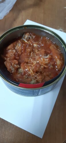 Купили банку, в г. Махачкала, сеть магазинов "Зелёное яблоко". Качество продукта не соответствует описанию. Субстанция в банке желеобразная, перевареная рыба превратилась в кашу. На вкус что то похоже на кильку в томате.