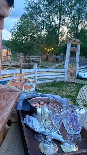 Хорошее место со своими плюсами и минусами. Приятные хозяева, вежливые. Очень вкусная еда, приносят в домик! Не пожалели, что взяли на весь день ее. Потрясающее озеро рядом куда точно хочется вернуться, много птиц. Мы видели журавлей и даже лося, очень красивый лес. У хозяев есть сапы и аренда на весь день - отличная услуга! И квадрики. Так же понравился чан и глинтвейн. Все сделано с заботой о гостях. В домике так же есть все необходимое для проживания. Если у вас нет дачи, есть дефицит общения с фермерскими животными, и маленькие детки, то это место для вас))) Если же вы любите тишину, красоту и хотите выспаться, то не рассчитывайте. Это ферма: петухи кричат утром, потом кричат козочки, и в течение дня частенько лают собаки (а их там несколько). Как по мне, идея интересная, но реализация страдает. Объясню свой взгляд. Козочки, пони, гуляющие на участке это прекрасно. Однако ходить вы будете в основном по деревянным дорожкам, потому что весь участок в фекалиях этих животных. И почти нет травы, ее съедают. Наверное я бы все же делала отдельный загон, куда люди могут заходить и проводить время с животными. Нам не очень понравилось обустройство участка, мангальная зона, странные железные стулья с дырками, грязный гамак. Участок как бы голый, все кусты и деревья за заборчиками, но их все равно козочки обгладывают и выглядит это все не очень. Вечером красиво, да, есть фонарики. И еще минус - это матрас. Очень неудобный, с одной стороны вообще проваливаешься в яму. У нас обоих болело тело уже после первой ночи :( Резюмирую. Цена очень приятная, но и качество пока на нее отзывается. Я бы сюда вернулась в случае другого матраса и благоустроенного участка. Желаем хозяевам развития, они точно любят свое дело ♥️