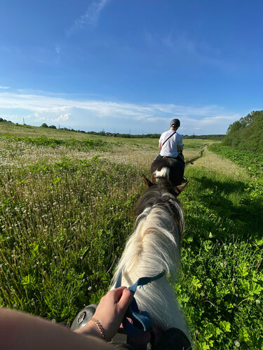 Место нам с парнем очень понравилось! Маршрут самый красочный и живописный из всех где бывали на прогулках. Мы пошли на 1,5 часа (прям вдоволь нагулялись, хотя для новичков возможно многовато). Несколько раз пробежали рысью и попробовали галопом. Лошади очень красивые, ухоженные, умные. Выдают шлемы, но не выдают краги. Когда вы в кроссовках это не очень хорошо. Хозяйка по началу показалась грубоватой, но и мы опоздали на 15 минут, спасибо что не отменили! В процессе езды разговорились, она нам все объясняла как ездить и рассказала некоторые вещи о технике и не только, которые я никогда раньше не слышала (можно сказать мы переучивались в процессе прогулки), так что прогулка вышла очень интересная и поучительная и разнообразная по местности. Появилось желание приехать позаниматься на тренировку. Тк мало, кто так объясняет все подробно. Если бы хозяйка была чуть мягче по общению, было бы вообще прекрасно. Тк многие вещи мы не знаем и не сразу получается их сделать, даже когда внимательно слушаешь. Но мы бы в любом случае еще вернулись, если появится возможность, тк живем далеко. Лошадок можно угощать едой, мы этого не знали. Так что берите с собой вкусняшки. Место очень рекомендую! Единственное что подпортило мои впечатления это хаски при въезде, которые были в вольерах с крышей из профлиста, там парилка, без воды в мисках, при солнце и жаре в 29 градусов. Наверно их выгуливают, но в вольерах же и фекалии находились, собак стало жалко.