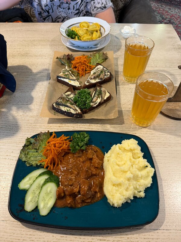 Обалденная кафешка. Я даже не ожидала что так вкусно будет. Гуляш по госту прям окунул меня в детство. Пельмени ручной лепки с бараниной и кинзой вкусные сочные. Бутерброды с шпротами тоже восторг.