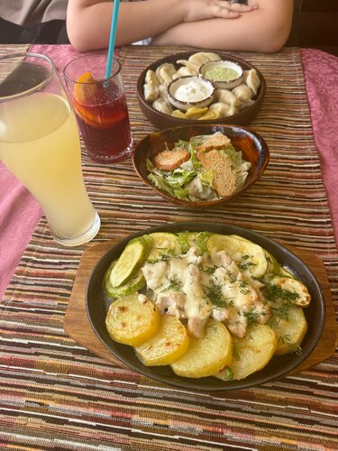 В первый день в Ростове пошли в это кафе. Сет пельменей и вареников классный) а вот скоблянка с курицей видимо постояла на столе раздачи в ожидании и заветрилась. Сыр комком был. В целом прикольное заведение, перекусить можно. Смутило только то, что вход на веранду у них через кухню. В верхней одежде проходили через стол раздачи. Официантка заранее зашла на кухню шепотом сказала «у нас гость». Видимо чтоб не косячили)