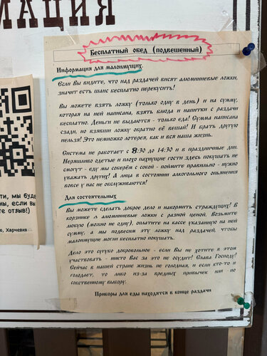 Типичная столовка. Вкусно, быстро, дешево. Есть концепция «подвешенных» обедов. Возможность помочь кому-то, попавшему в трудную ситуацию.