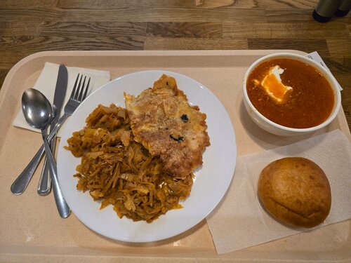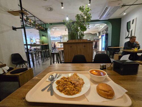 Современный модный ремонт, приветливый персонал на раздаче в форме, большие порции, все свежее, есть большой туалет. Блюда типичные для столовой, но приготовлены хорошо и выглядят аппетитно, ценник приемлемый для уютной атмосферы и расположения в центре города, в час-пик заведение заполнено, но найти место можно.