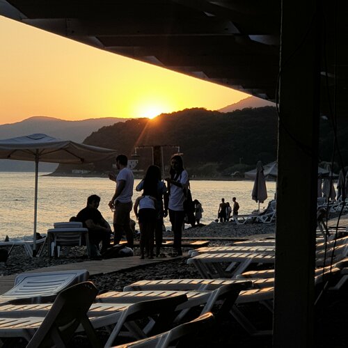 Пляж галечный, чистый. Вода прозрачная, голубая. На берегу есть кафе, торговые палатки, шезлонги, зонтики и шатры, душ. Для меня это самый лучший пляж! Посетите его и никогда не пожалеете!