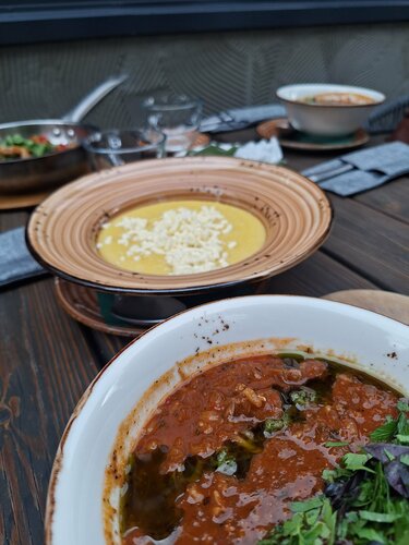 Очень вкусно и красиво. Места всегда есть, брони заранее нет. Пустили с собачкой, что было важно для нас. Сковородка, харчо, бургер с мраморной и мамалыга прекрасны и очень сытные. Так же лимонад инжир-бузина покорил своим вкусом благодаря тимьяну и семенам чиа
