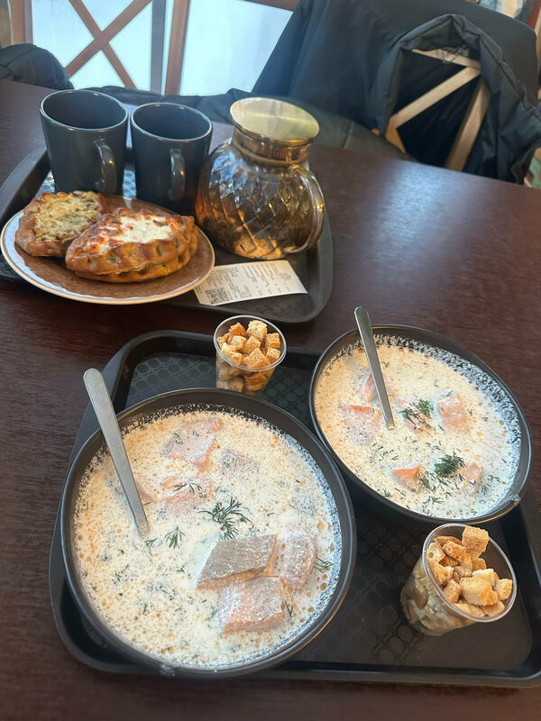 Не очень поняла всеобщего восторга, честно честно. Заехали покушать карельскую уху, по получили по факту рыбный бульон, в который в огромном количестве добавлено подсолнечное масло и немного сливок. Но рыбы было очень много, здесь вопросов нет. Но практически вся рыба была с косточками, их было таааак много, что суп мы ели крайне долго. Калитки здесь тоже не понравились, но это вкусовщина. А ещё очень много людей и очень неудобно, что всего 1 касса и на сувениры, и на кафе. Второй раз бы сюда не вернулась.