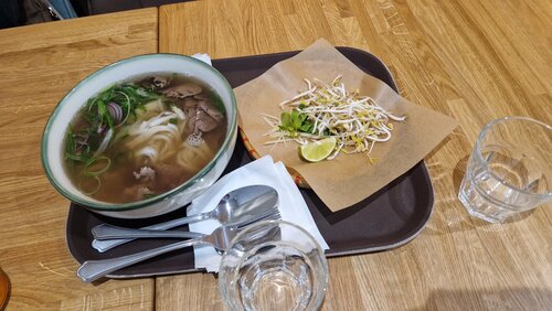 В пятничный вечер, именитые заведения в центре Питера, как правило переполнены. Но не это, поэтому решили зайти, заолно попробовать въетнамскую кухню. Были удивлены масштабностью порций. ФоБо 1 л., взяли один на двоих. Специи в супе специфичные, лапша как разваренная. Жаренные креветки в панировке - жирновато, много масло, но сытно. Тоже самое могу сказать о жаренной свинине в тесте с пыбным соусом. Столиков много, внутри заведения несколько залов. Приятная музыка. Мобильная связь внутри заведения не берёт. Посетить стоит.