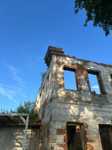 Пять звезд исключительно за кошку Машку, добрую и ласковую хранительницу усадьбы и за очень душевного энтузиаста, охраняющего руины. Это именно руины. К ним прислонен плакат с маниловскими прожектами восстановления усадьбы, но пока средств хватает на покос травы. Пруд зимой используется как каток, потому рядом с ним построены лавочки. Дорожки присыпаны галькой. Пекарня несмотря на объявленный график «до 18 часов», в 17:15 уже не работала.