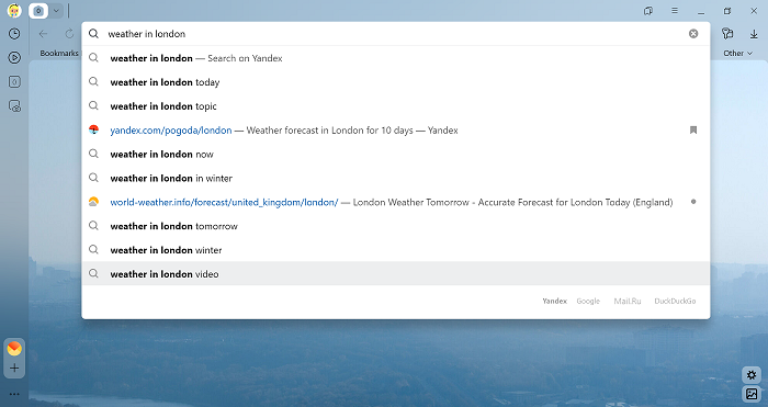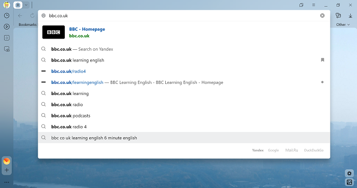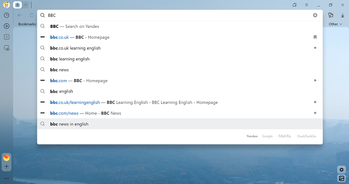 The SmartBox is the main Yandex Browser element for entering URLs and searching for information. The Yandex search engine is normally used to search for answers to your query. You can change your search engine if you want to. You can't disable or remove the SmartBox.