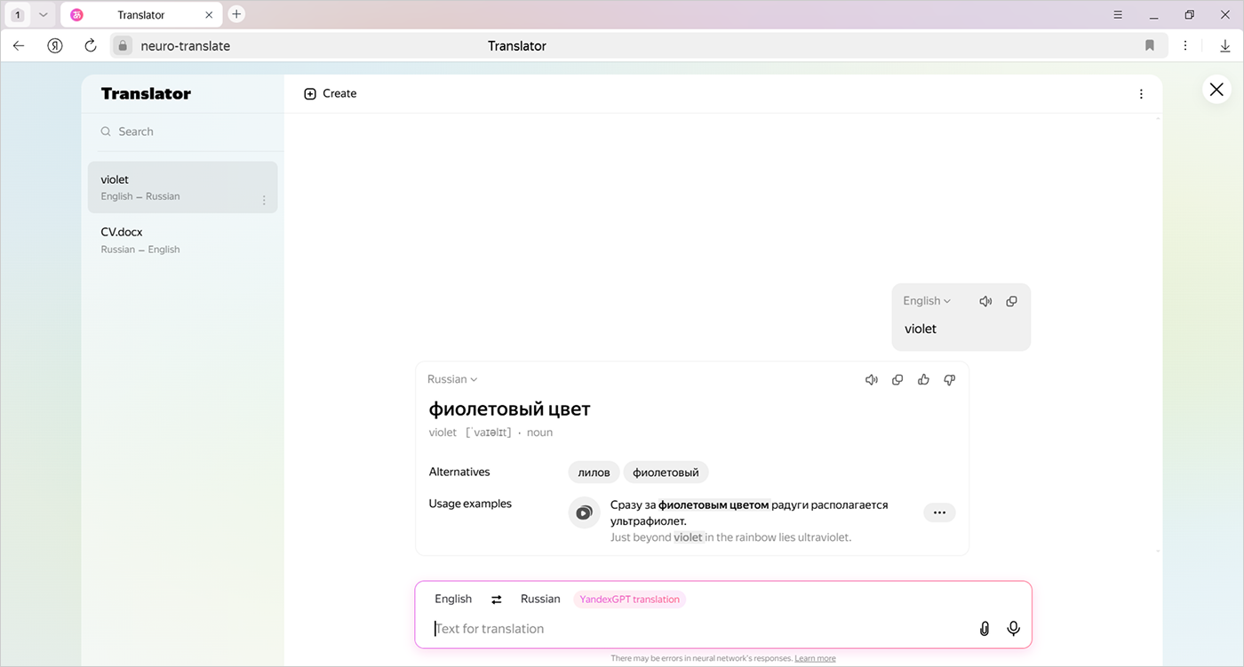 Yandex Browser will prompt you to translate the page if its language is different from your interface language. You can access Yandex Translate or translate specific words, images or videos using the context menu.