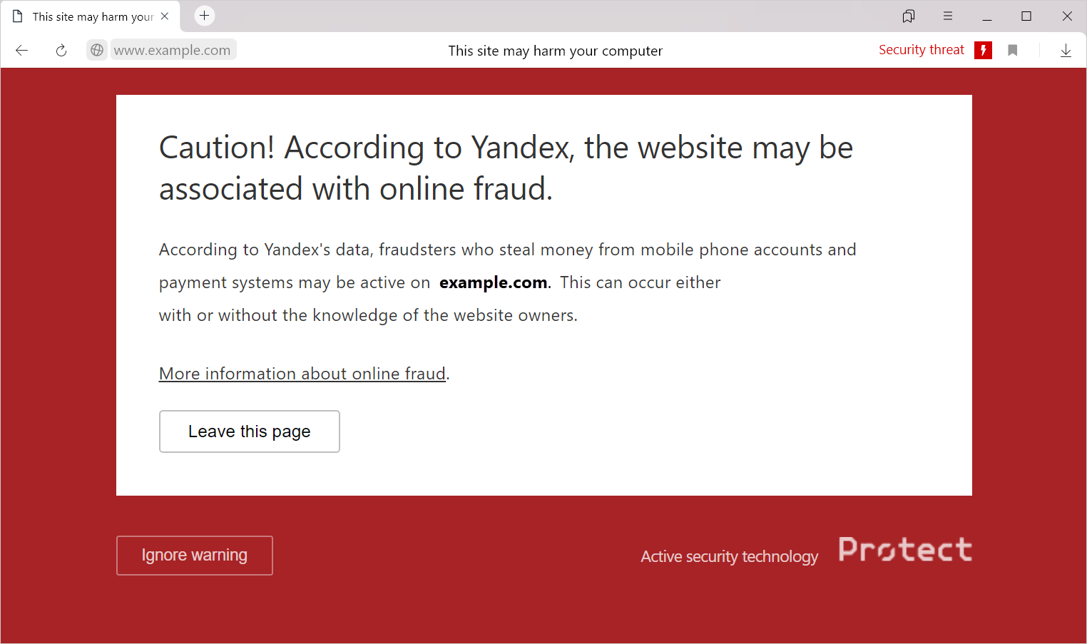Yandex tracks phishing sites and resources that may be used by scammers. The addresses of such sites are stored in a special database. If you're trying to visit a site that may be linked to internet fraud, Yandex Browser blocks the potentially dangerous page and informs you about it. You'll see a message in the Yandex Browser window and the icon in the SmartBox.