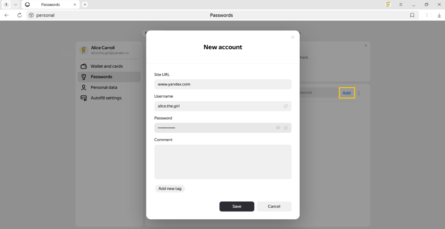 Similarly, you can save in the password manager your passport number and other confidential information. If bank card saving is enabled, the data will be available on all your devices. You don't have to worry about the security of your data because it is stored in encrypted format.