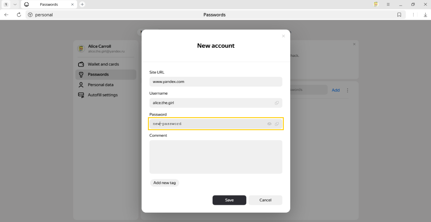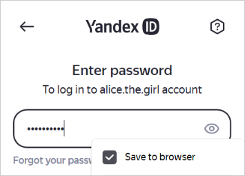 If you enter a password with no username, Yandex Browser suggests a previously saved username.