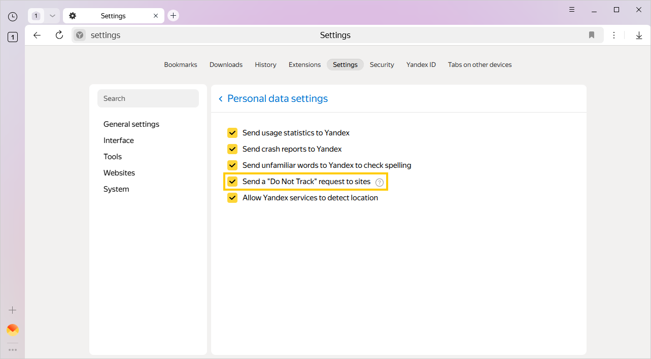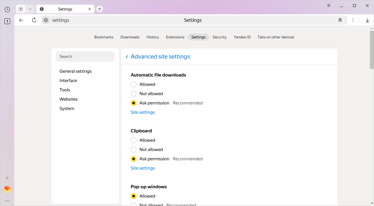 To provide safe and convenient browsing experience, Yandex Browser applies various processing rules to site elements. It blocks pop-ups, warns you when a website requests your location, and so on. To change Yandex Browser behavior for all sites or the selected one, go to settings or use the Protect panel. For example, you can choose to block JavaScript on all sites or allow a site to access your camera.