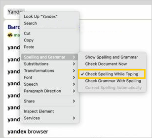 Spellcheck is enabled in Yandex Browser for the language selected as the default in the operating system.