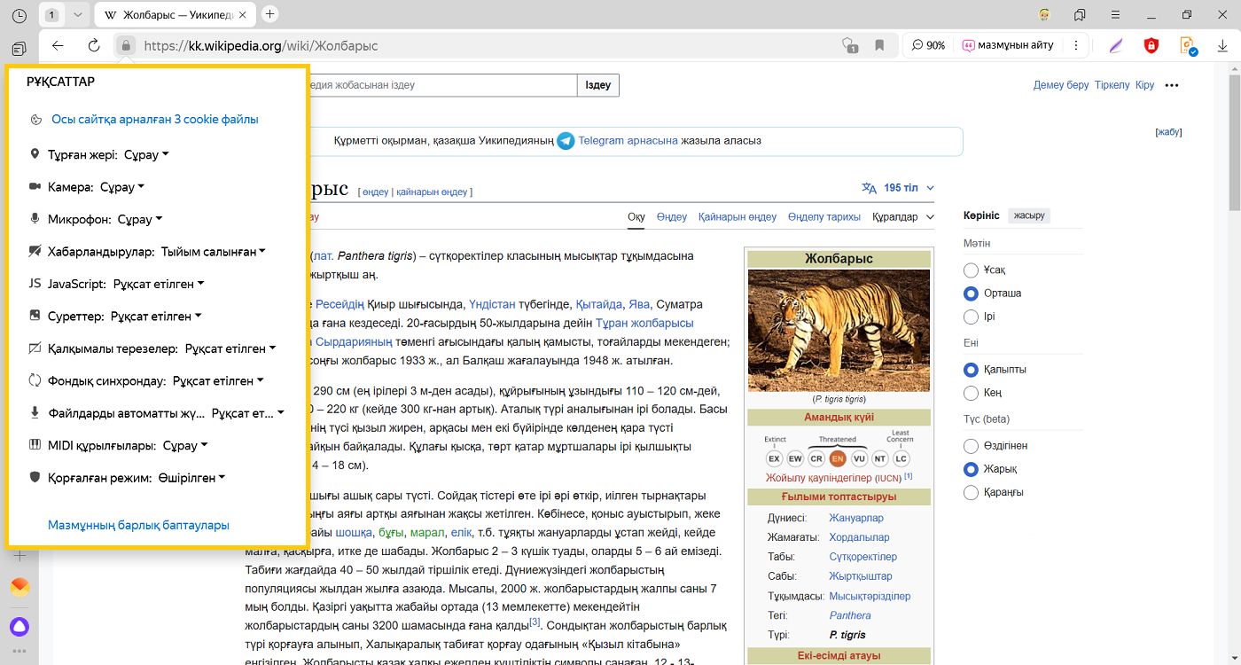Әдепкі бойынша Яндекс Браузерінде cookie файлдарын сақтауға рұқсат етіледі.