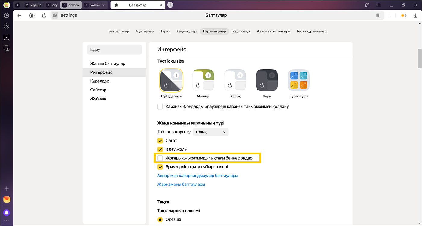 Жаңа қойындыдағы сілтемелердің мәтіндері мен батырмалардың атаулары оңай оқылуы үшін компьютерден жүктелген барлық фондарға қараңғылату фильтрі қолданылады. Бұл фильтрді алып тастау мүмкін емес. Егер сіз одан жарықтау фон алғыңыз келсе, бастапқы суреттің жарықтығын арттырыңыз.