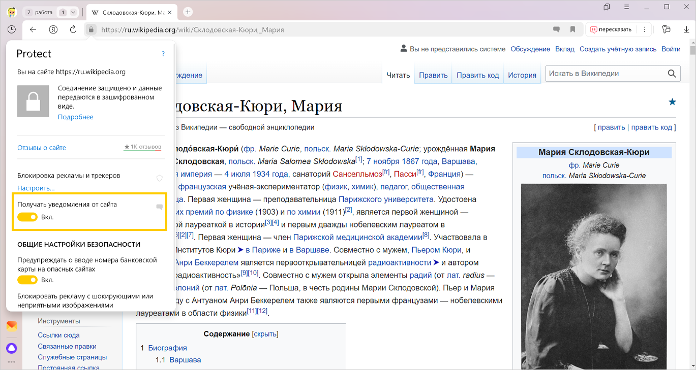 3. Ашылған Protect панелінде Осы сайттың хабарландыруларын алу опциясын қосыңыз немесе өшіріңіз.