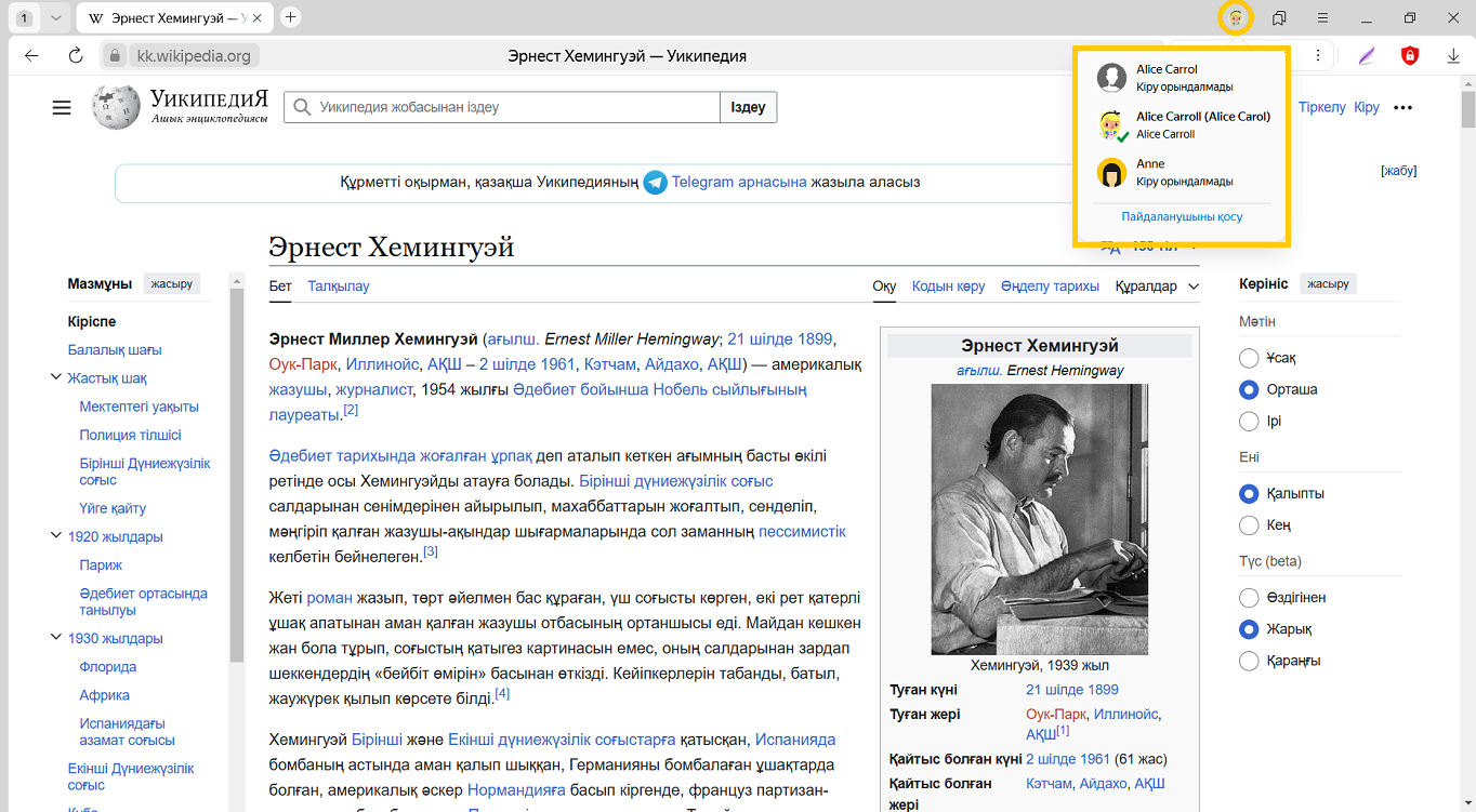Таңдалған профиль портреті бар Браузердің жаңа терезесі құрылады. Браузердің барлық профильдерін баптауларда көруге болады: