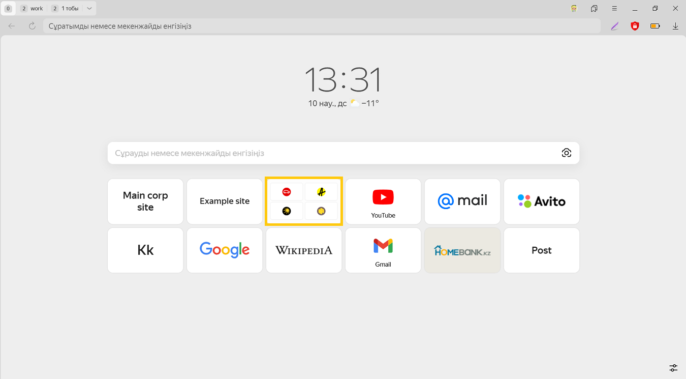 Сіз плиткаларды қалталарға топтастыра аласыз. Мысалы, Яндекс қызметтеріне сілтемелері бар плиткалар әдепкі бойынша бір қалтаға топтастырылған.