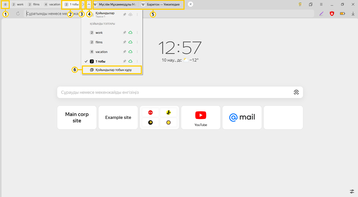 Яндекс Браузерде қойындылар топтарын кез келген терезеде ашуға болады. Ол үшін таңбасын басыңыз және қажетті топты таңдаңыз.