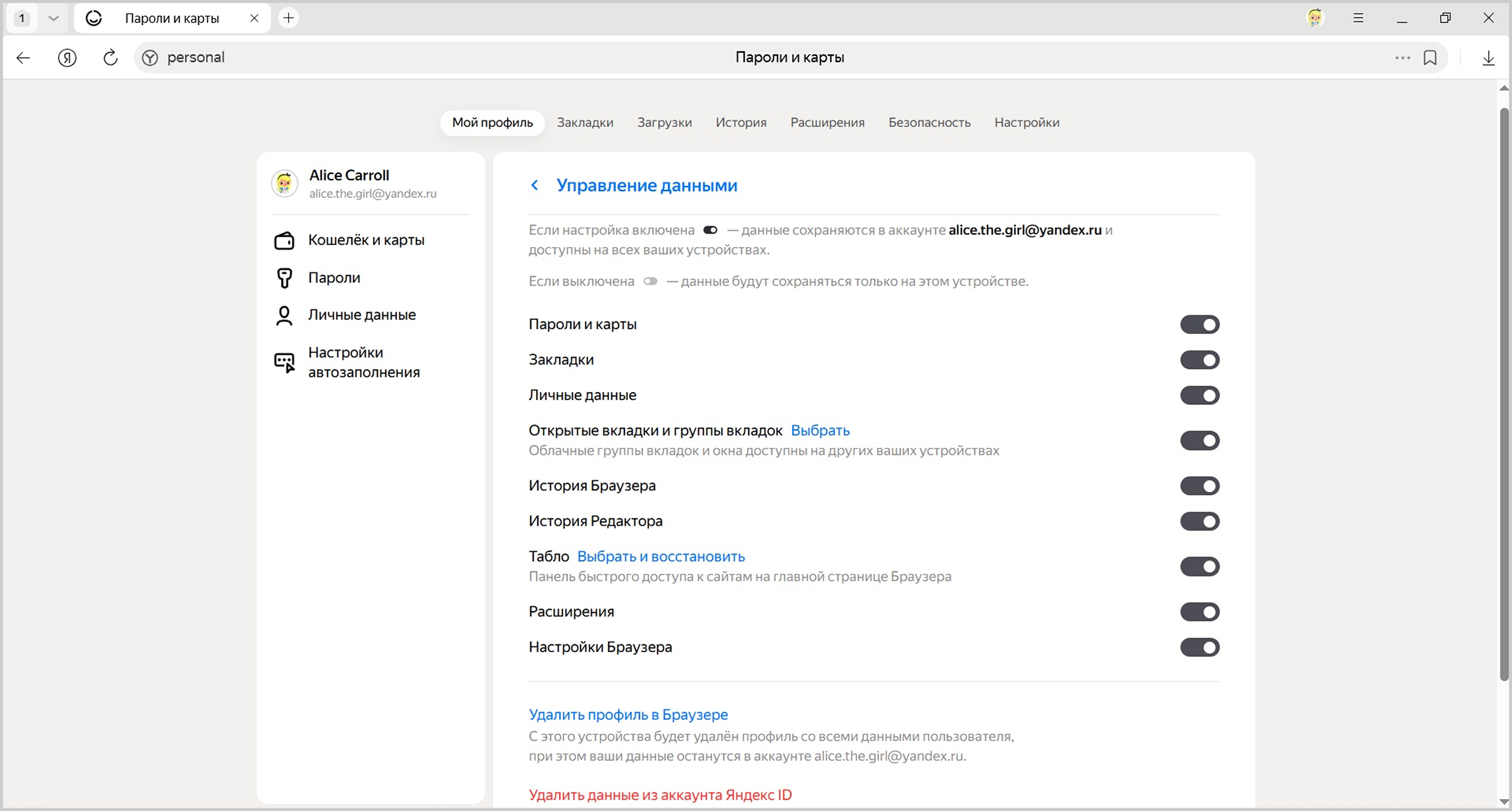 Данные по умолчанию автоматически сохраняются в вашем аккаунте, который привязан к Яндекс ID, и доступны на всех ваших устройствах (компьютере, смартфоне, планшете), на которых установлен Яндекс Браузер.