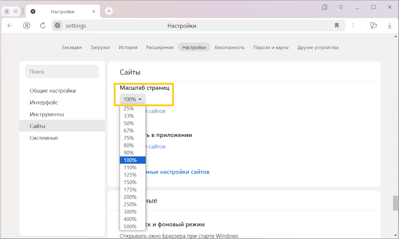 2. В разделе Масштаб страниц нажмите Настройки сайтов.
