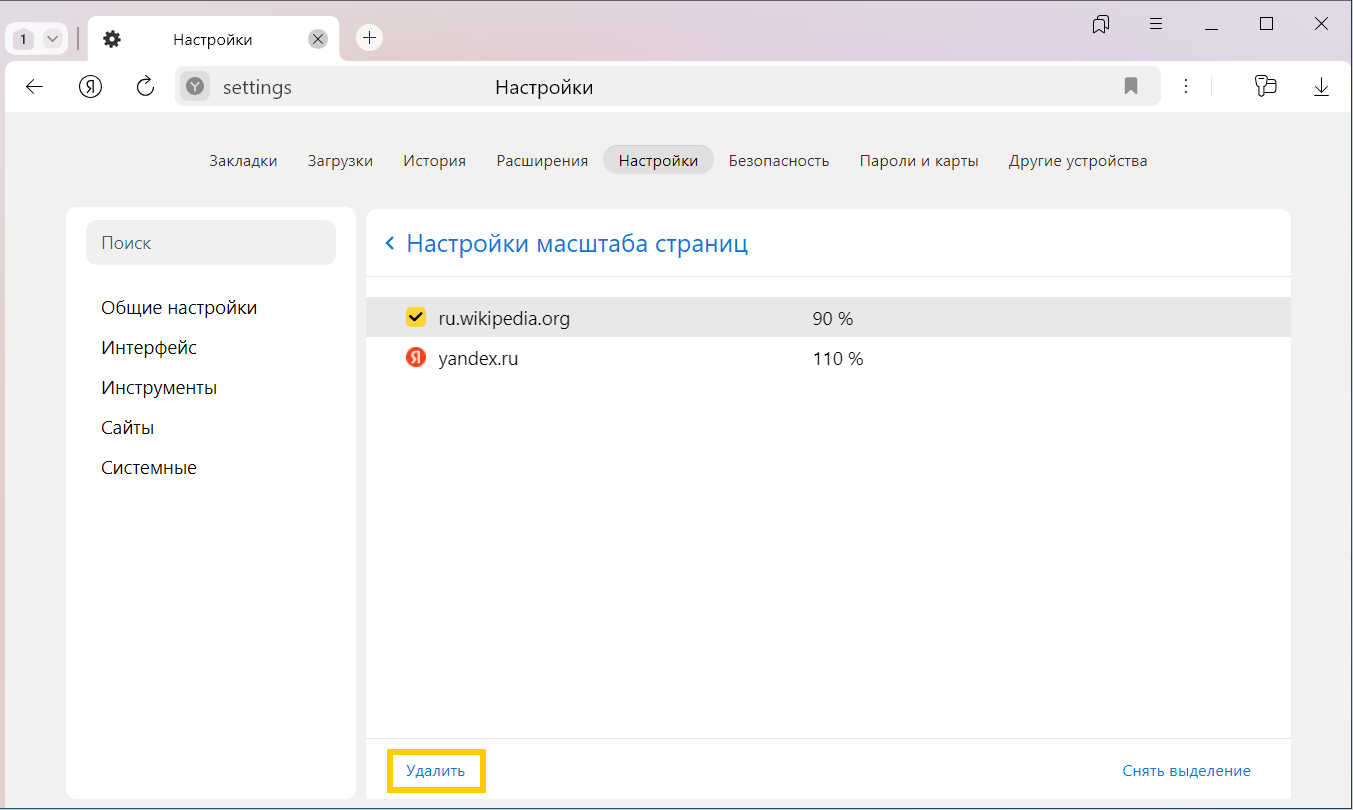 Данные об измененном масштабе сохраняются в Яндекс Браузере. При повторном открытии страница будет отображаться в выбранном вами масштабе.