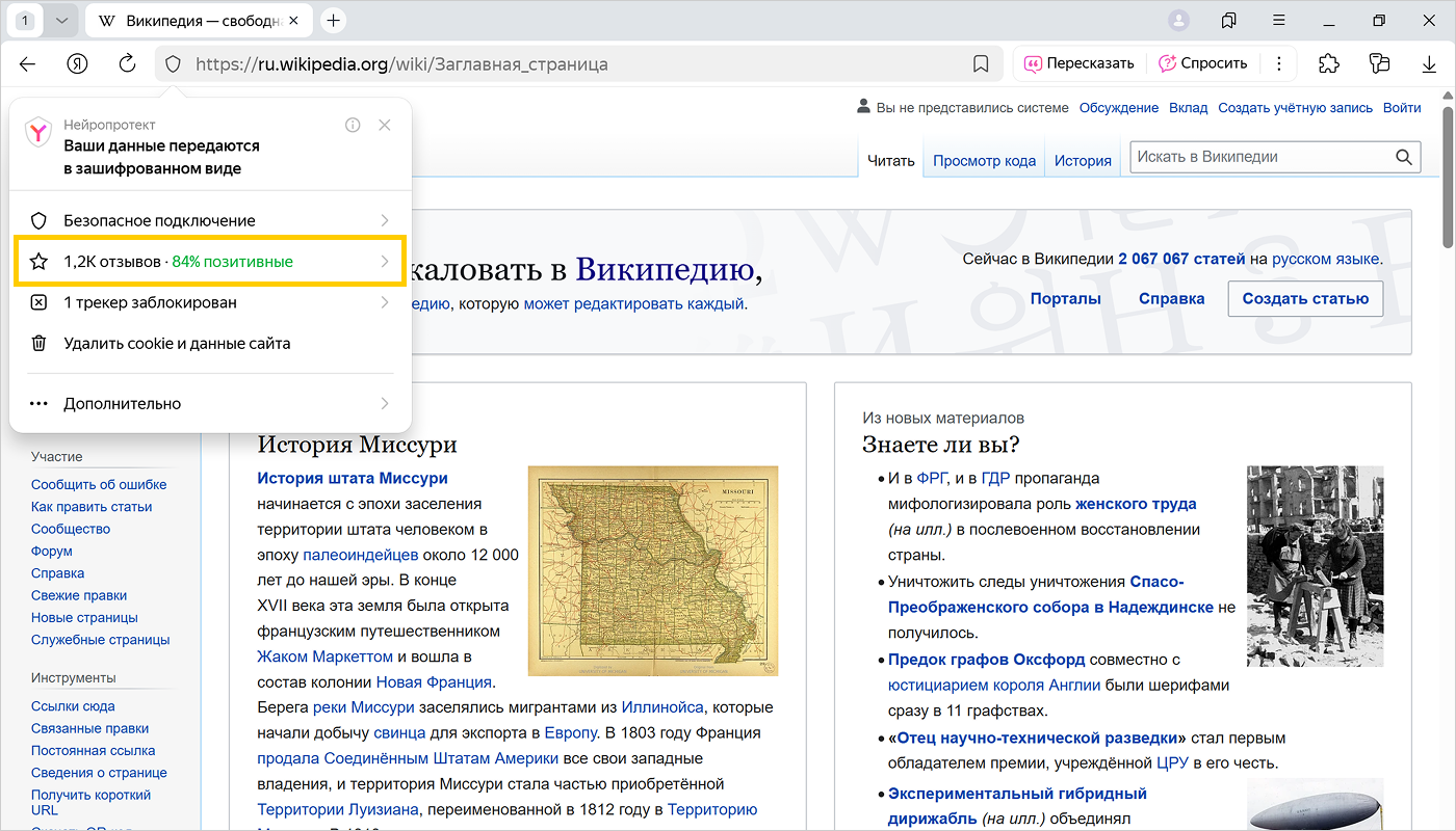 В Умной строке слева нажмите значок статуса соединения. Откроется панель Нейропротект.