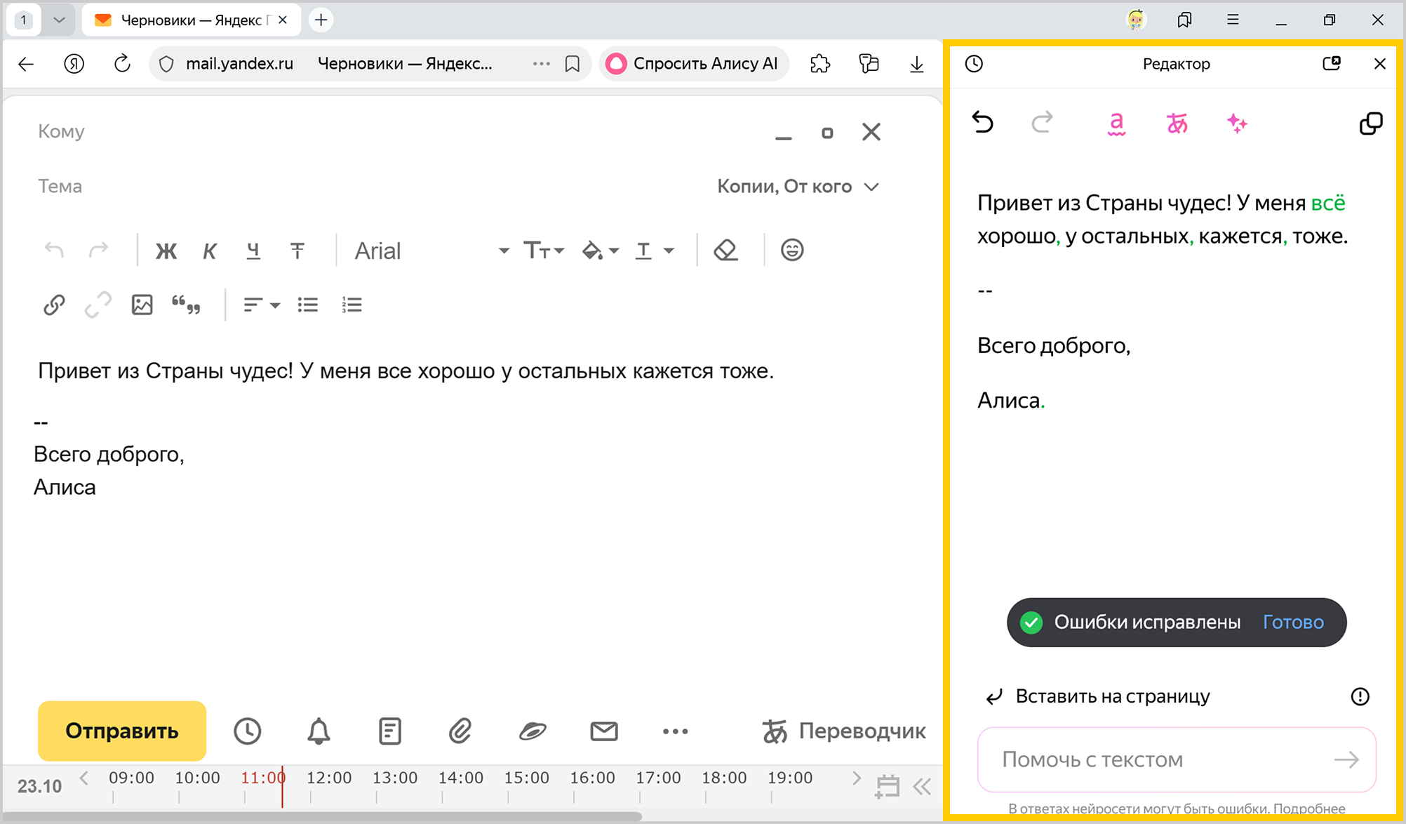 Редактор в Браузере помогает написать, отредактировать и улучшить текст, используя Алису AI. Он исправит ошибки, улучшит стиль, переформулирует или переведет текст на другой язык. Это удобно при подготовке любых текстов: от электронных писем и постов в социальных сетях до научных статей и художественных произведений.