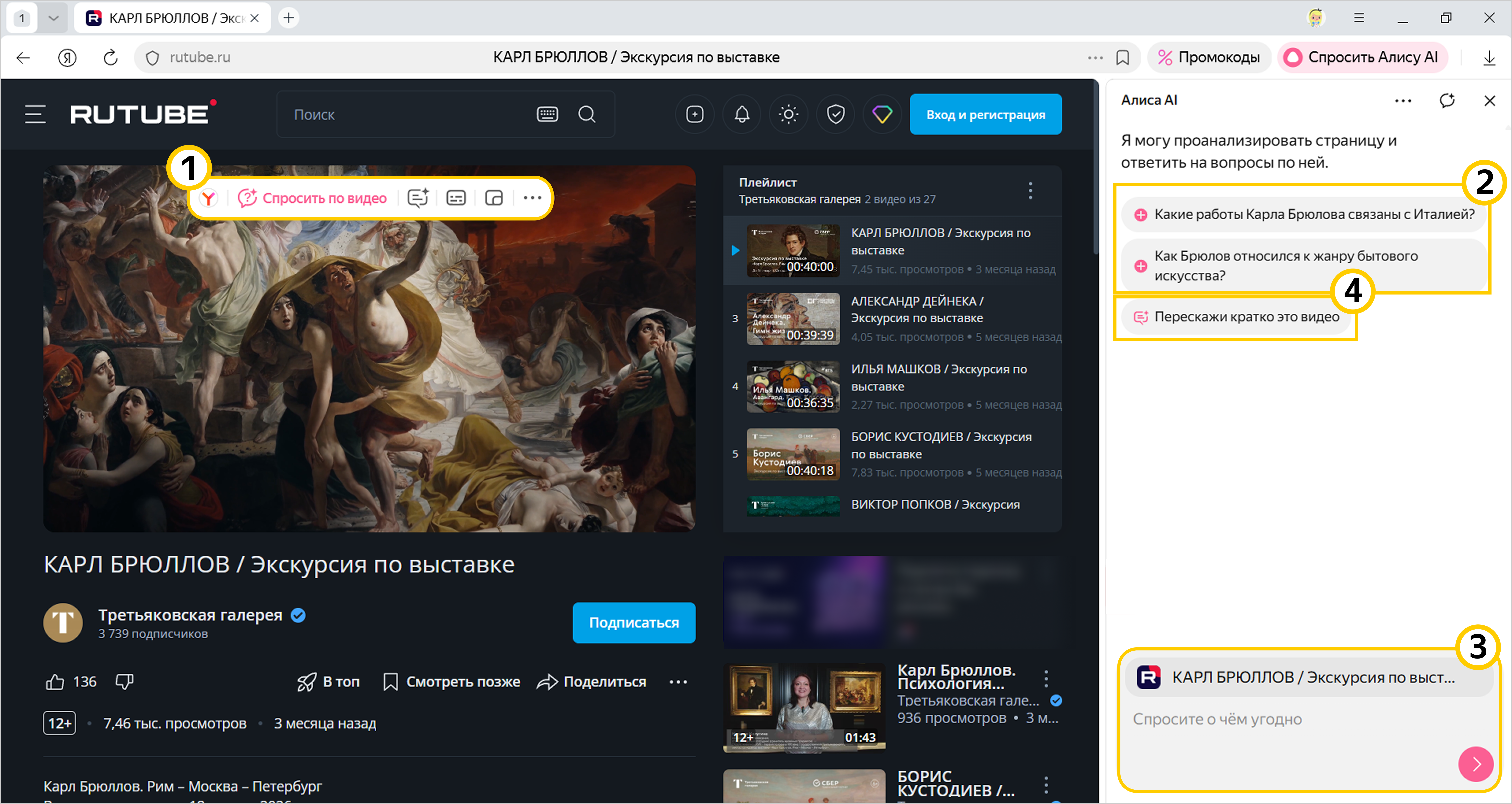 Алиса AI может ответить на вопросы, если на странице только одно видео. Если на странице несколько видео, вы можете задать вопрос к странице.