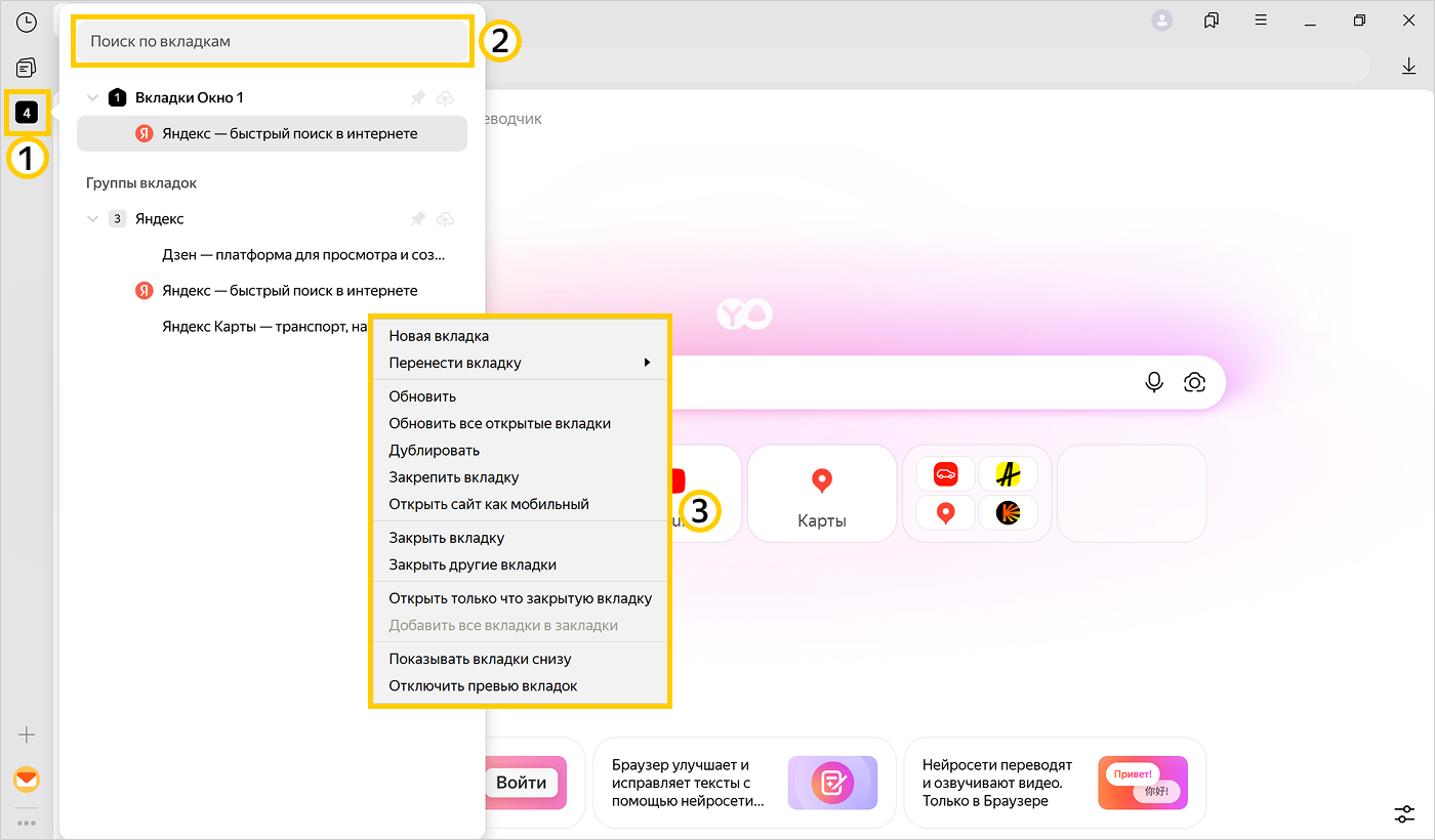 Когда открыто много вкладок, в них трудно ориентироваться. Яндекс Браузер предлагает работать с большим количеством вкладок в специальной панели, где вкладки отображаются в виде вертикального списка и объединяются в группы.